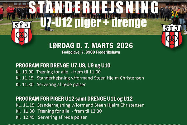 jan31 Standerhejsning for U7–U12 piger og drenge lørdag den 7. marts LÆS MERE Sæson 2026 officielt skudt i gang i Ffi FodboldLørdag blev flaget hejst, og dermed er sæson 2026 for alvor i gang i Ffi Fodbold. Flaghejsningen...[ LÆS MERE ] Standerhejsning 2026LØRDAG D. 24. JANUAR 2026[ LÆS MERE ] Historisk præstation for FFI U17!FFI vinder U17 Liga 1 med maksimumpoint og sætter måske en ny danmarksrekord[ LÆS MERE ] Fællesskab, frikadeller og fodboldglæde – ungdommen samles hos FFI!Af Michael Jørgensen[ LÆS MERE ] Støt FFI FodboldVi har indgået en sponsoraftale med OK, så du kan støtte FFI Fodbold hver gang du tanker, lader på...[ LÆS MERE ] Fodboldfest og venskaber på tværs af SkagerrakFfI Fodbold U13 og U14 hjemme efter uforglemmelig Norgestur[ LÆS MERE ] Se alle nyheder her