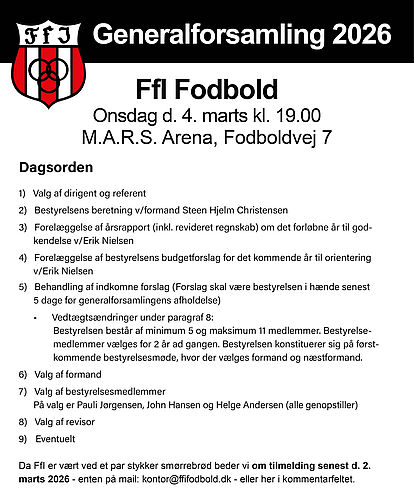 feb18 Generalforsamling 2026 LÆS MERE Varmt skulderklap i en kold tid til FfI Young BoysFfI Young Boys modtog 35.000 kr. i støtte fra Østifternes Almennyttige Fond[ LÆS MERE ] 75 års makkerskab: Spar Nord og FfI Fodbold fejrer ”kronjuvelbryllup” og forlænger sponsoraftaleI 2026 kan Spar Nord og FfI Fodbold fejre et historisk 75-års jubilæum for deres samarbejde, både...[ LÆS MERE ] Standerhejsning for U7–U12 piger og drenge lørdag den 7. marts[ LÆS MERE ] Sæson 2026 officielt skudt i gang i Ffi FodboldLørdag blev flaget hejst, og dermed er sæson 2026 for alvor i gang i Ffi Fodbold. Flaghejsningen...[ LÆS MERE ] Standerhejsning 2026LØRDAG D. 24. JANUAR 2026[ LÆS MERE ] Historisk præstation for FFI U17!FFI vinder U17 Liga 1 med maksimumpoint og sætter måske en ny danmarksrekord[ LÆS MERE ] Se alle nyheder her
