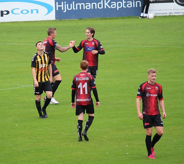 Ikke desto mindre var det frederikshavner-drengene, som bragte sig foran midtvejs i første halvleg. Et klassisk langt indkast fra Nicolas Strauss førte til en afslutning fra Kasper Sørensen. Returen fra anførerens forsøg endte hos Mikkel Tolstrup, som i det lille felt flot sparkede bolden op i nettaget. 1-0 til rød/sorte!
