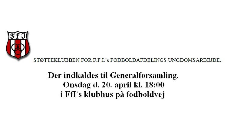 Der indkaldes til Generalforsamling, Onsdag d. 20. april kl. 18:00i Ffi´s klubhus på fodboldvej